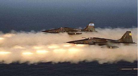 | Bombs: 7,000 lb (3,200 kg) of payload on five external hardpoints, including a variety of air-to-ground ordnance, such as the Mark 80 series of unguided iron bombs (including 3 kg and 14 kg practice bombs), U.S. CBU-24/49/52/58 and British BL755 cluster bomb munitions, M129 Leaflet bomb and drop tanks for extended range |