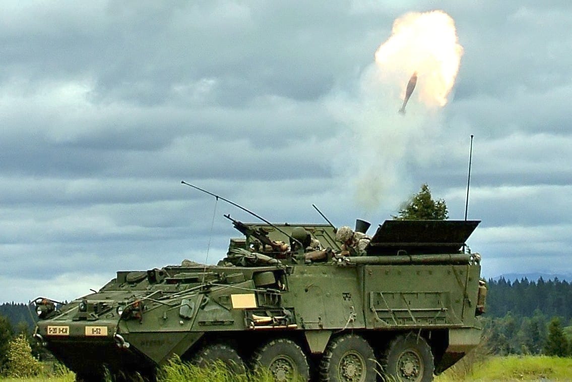 For more firepower, the Stryker land vehicle can also carry two tube launched, optically-tracked, wire-guided (TOW) missile systems, a 120mm recoil mortar system, or a 105mm main gun, depending on its configuration.