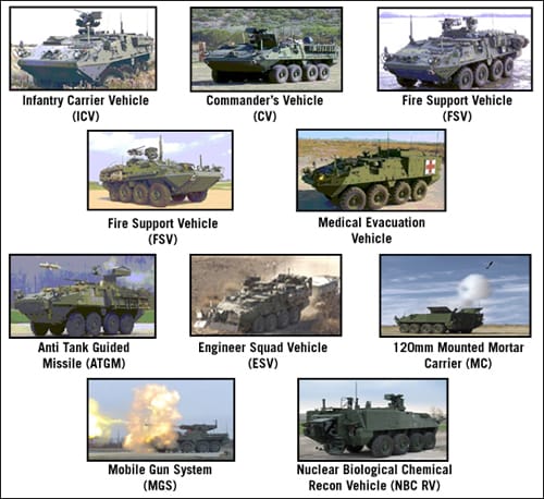 These include anti-tank guided missiles, mobile C4ISR, engineering support, fire support (target ID, acquisition, and designation), 9-man infantry transport, medical evacuation, mobile gun system, mortar, NBC reconnaissance, and general reconnaissance capabilities.
